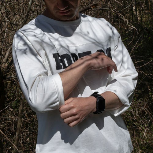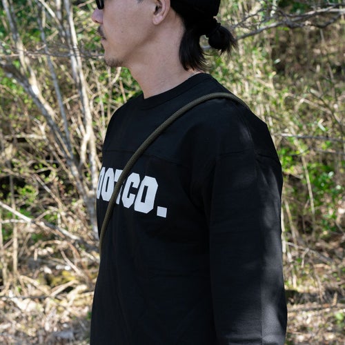 前面背面共に胸のあたりの高さで生地の切り替えステッチを施し、フットボールシャツの特徴である生地の切り替えデザインも忠実に再現しました。スタイリングのアクセントにもなるステッチラインです。前面のステッチラインの下に、インパクトのあるロゴをプリントしています。