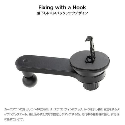 カーエアコン吹き出し口への取り付けは、エアコンフィンにフックパーツを引っ掛け固定をするタイプへアップデート。差し込み式と異なり固定力がアップする為、走行中の振動等に強く、安定性に優れています。