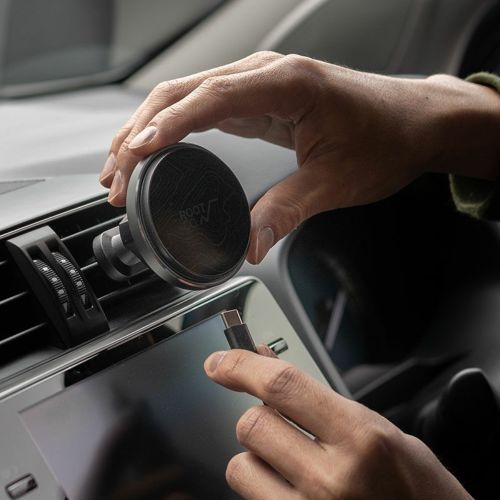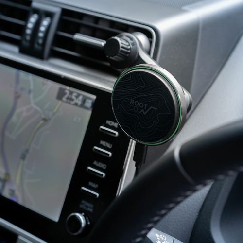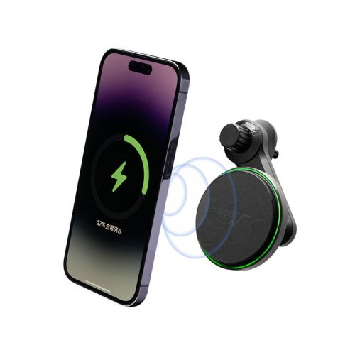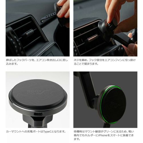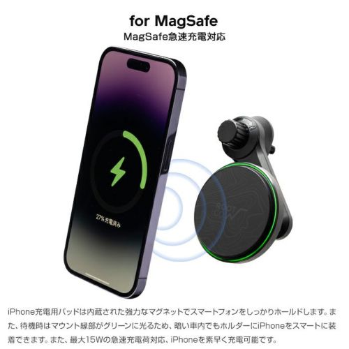 MagSafe対応のカーマウント(車載スマホスタンド)。MagSafe(磁気)を利用してiPhoneをホールド&ワイヤレス充電が可能です。