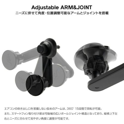 エアコン吹き出し口を邪魔しない長めのジョイントホルダーを搭載し、アーム部・ジョイント部で自由に角度調整が可能。また、カーエアコンへの取り付けは落ちにくいフックデザインのため、走行中の振動等に強く安定性に優れています。