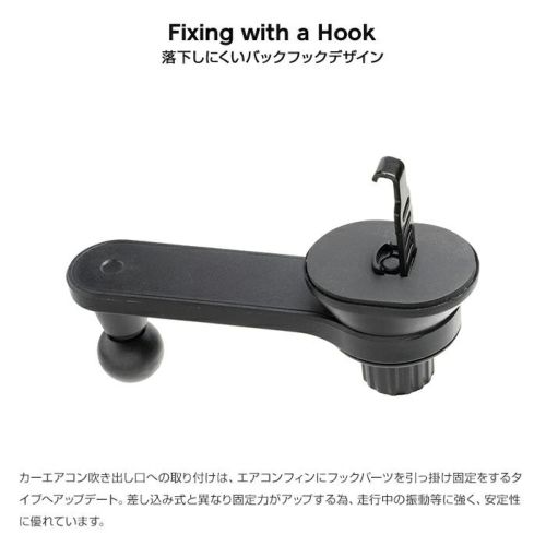 カーエアコン吹き出し口への取り付けは、エアコンフィンにフックパーツを引っ掛け固定をするタイプ。固定力が高いため、走行中の振動等に強く、安定性に優れています。