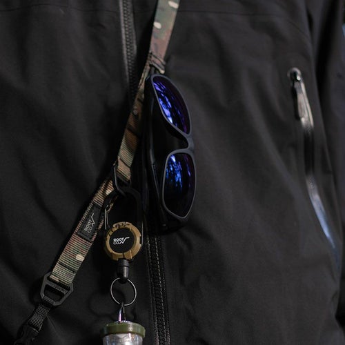 着用時に胸部に位置するように配置されたパラコードループは、サングラスホルダーとしても最適。