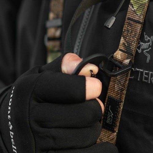 長さ調節パーツ部分には、折り返したウェビングテープをまとめるズレ防止サルカンリングを配置。
