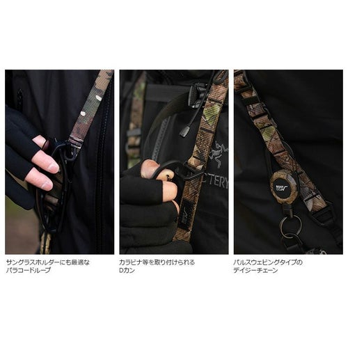 また本体素材にはウェビングを使用し、アウトドアスタイルとの相性も抜群なデザインを実現。フラットなストラップの為、首肩への負担が少なく快適に行動ができます。