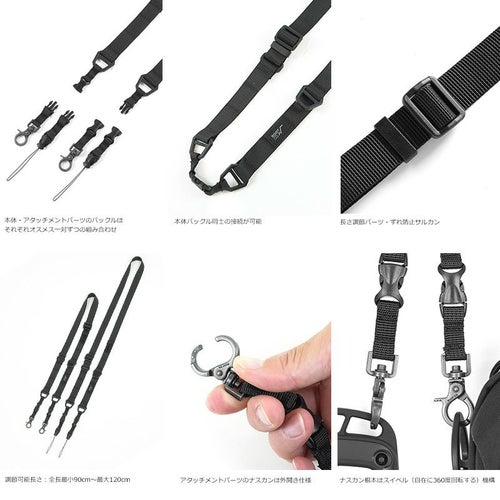 アタッチメントパーツは「ナスカンタイプ」と「ストラップタイプ」の両方がセットになっているので、カメラやストラップ穴や小さなループがあるスマートフォン・マルチツールにも対応可能。ナスカンタイプを利用すれば、手持ちのサコッシュのショルダーストラップとして使うことも。