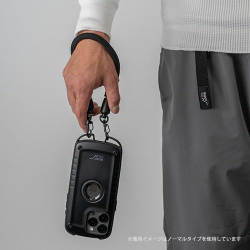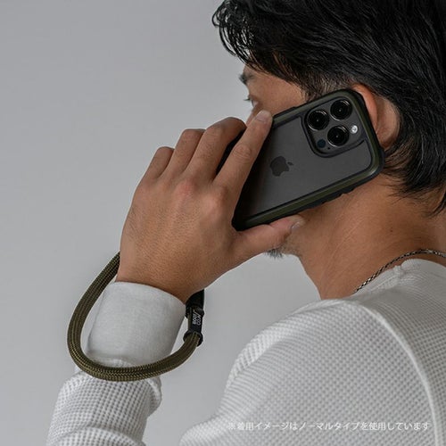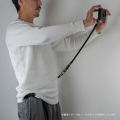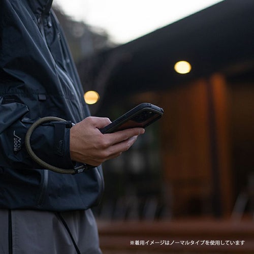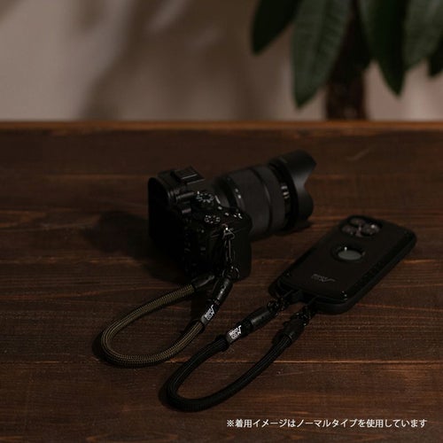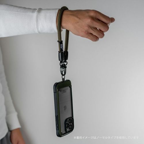 手首にかけられる短くかさばらない長さのショートストラップ。落下防止のハンドストラップとしてはもちろん、パンツのウエストループ等と繋いで紛失・落下防止のウォレットコードとしても使用できます。肩がけタイプのショルダーストラップと用途にあわせて使い分けても。