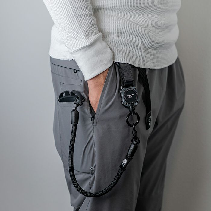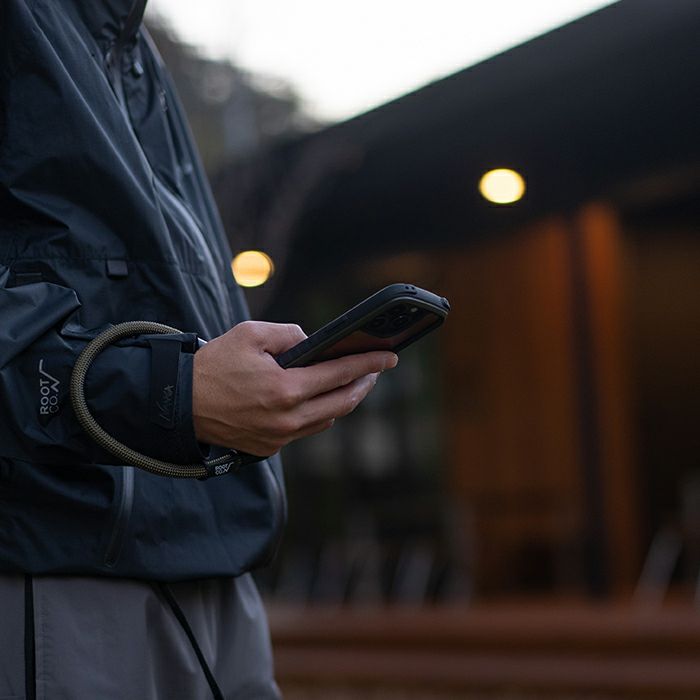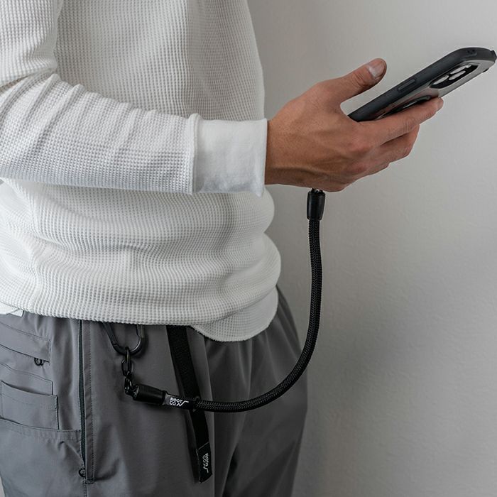 ロープ先端はナスカン仕様なので、カラビナループを搭載したROOT CO.のiPhoneケースであれば直接装着可能。また、「inner loop sheet」を使えばスマートフォン機種を問わずに装着できます。ナスカンはコラボレーション別注仕様のブラックカラー。