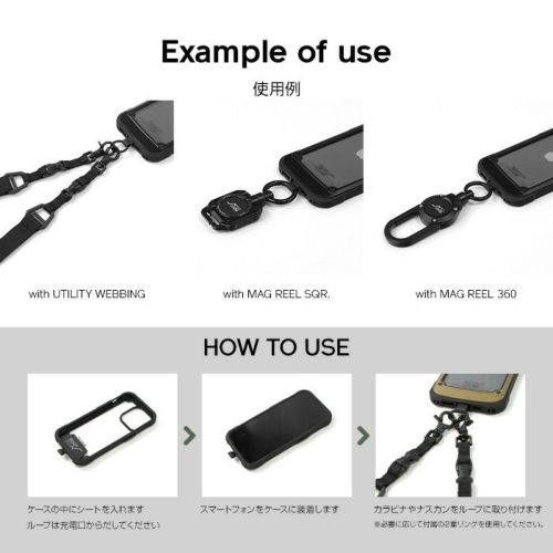 GRAVITY Shock Resist Case Tough&Basicのようなカラビナループ非搭載タイプのケースにも、カラビナ(MAG REEL 360)やスマホショルダー(GRAVITY UTILITY WEBBING NECK/SHOULDER LOOP)が取り付け可能です。