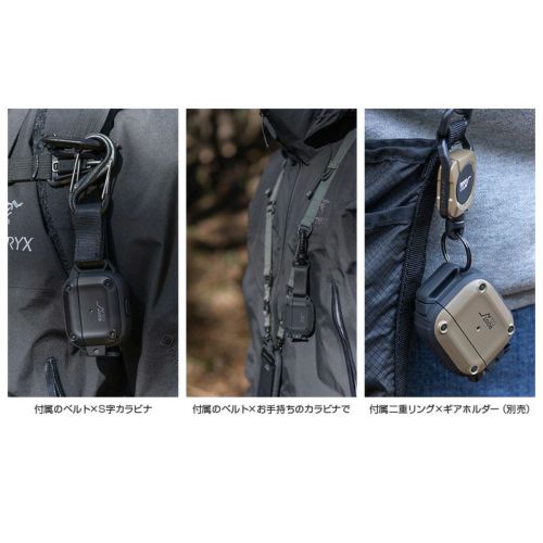 ケース本体サイドに、20mm幅のウェビングテープを取り付け可能なループを搭載。さらに専用のテープ&S字カラビナが付属、持ち運びの際にバッグやベルトに装着ができます。また2重リング等を通せるホールも備えているため、カラビナで吊り下げての使用も可能です。(お手持ちのベルト・テープ・ループ等もご利用いただけます。)