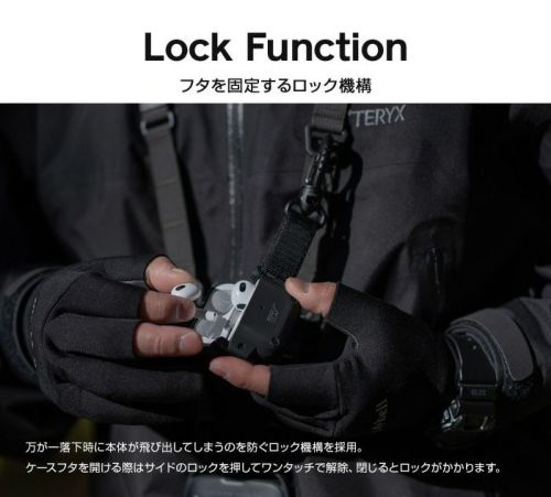 万が一落下時に本体が飛び出してしまうのを防ぐロック機構を採用。ケースフタを開ける際はサイドのロックを押してワンタッチで解除、閉じるとロックがかかります。