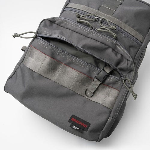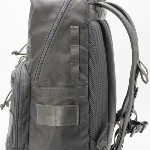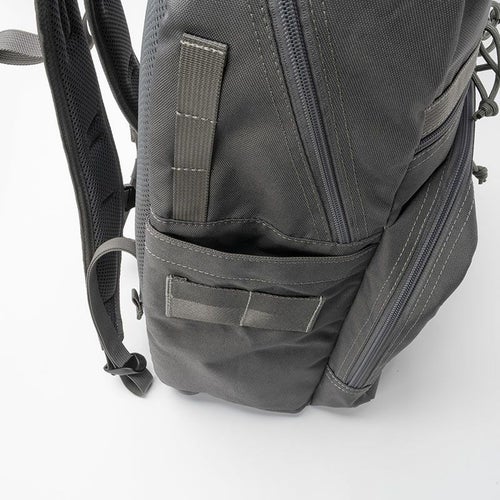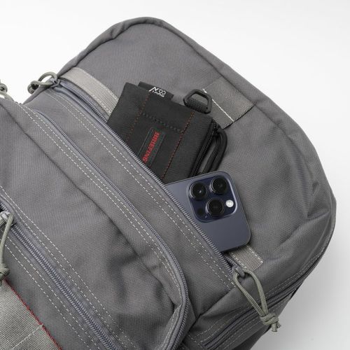 メインファスナー横には、縦方向に連なったループを配置。カラビナやMAG REELの装着が可能で、吊るしたギアをサイドポケットに入れることで紛失防止にも繋がります。