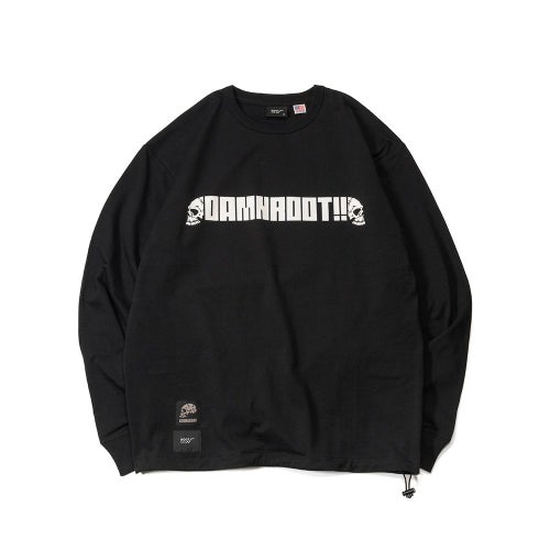 DAMNGOOD!! × ROOT CO.コラボレーションモデル。DAMNGOOD!!オリジナルフォントのコラボロゴをフロント・バックにプリントしました。裾元にはDAMNGOOD!!・ROOT CO.両ブランドの織ネームを配置。