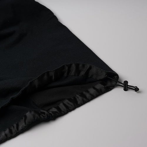 ドローコードを配した裾元デザインで、スタイルや気分に合わせて裾巾の調整が可能。生地がへたりにくいよう、裾元の裏側はナイロン生地で補強を施しています。