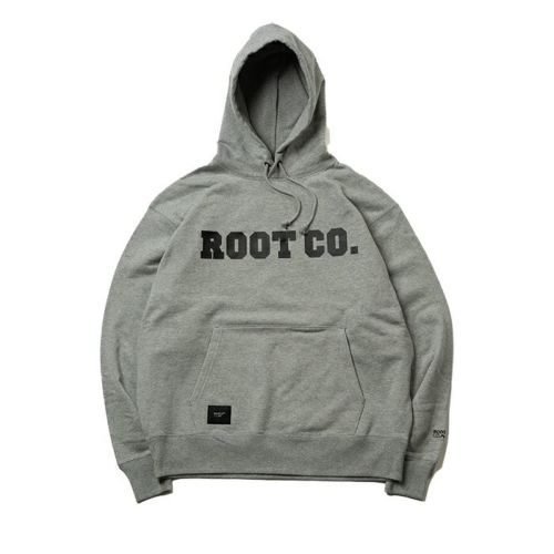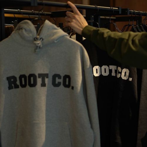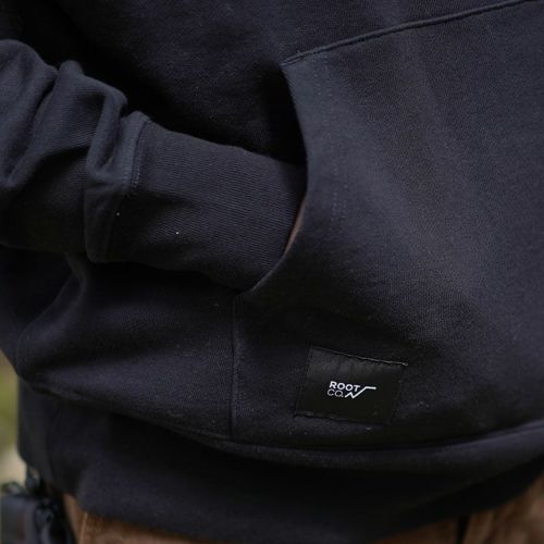 胸元にROOT CO.のロゴプリントを配置。また、右裾部にはロゴが施された織りネームを配しました。