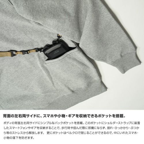 ボディの背面左右両サイドにシンプルなバックポケットを搭載。このポケットにショルダーストラップに装着したスマートフォンやギアを収納することで、歩行時や屈んだ際に邪魔にならず、揺れ・ひっかかり・ぶつかり等のストレスから解放します。 更にポケットはベルクロで閉じることができるので、中にいれたスマホ・小物の落下を防ぎます。