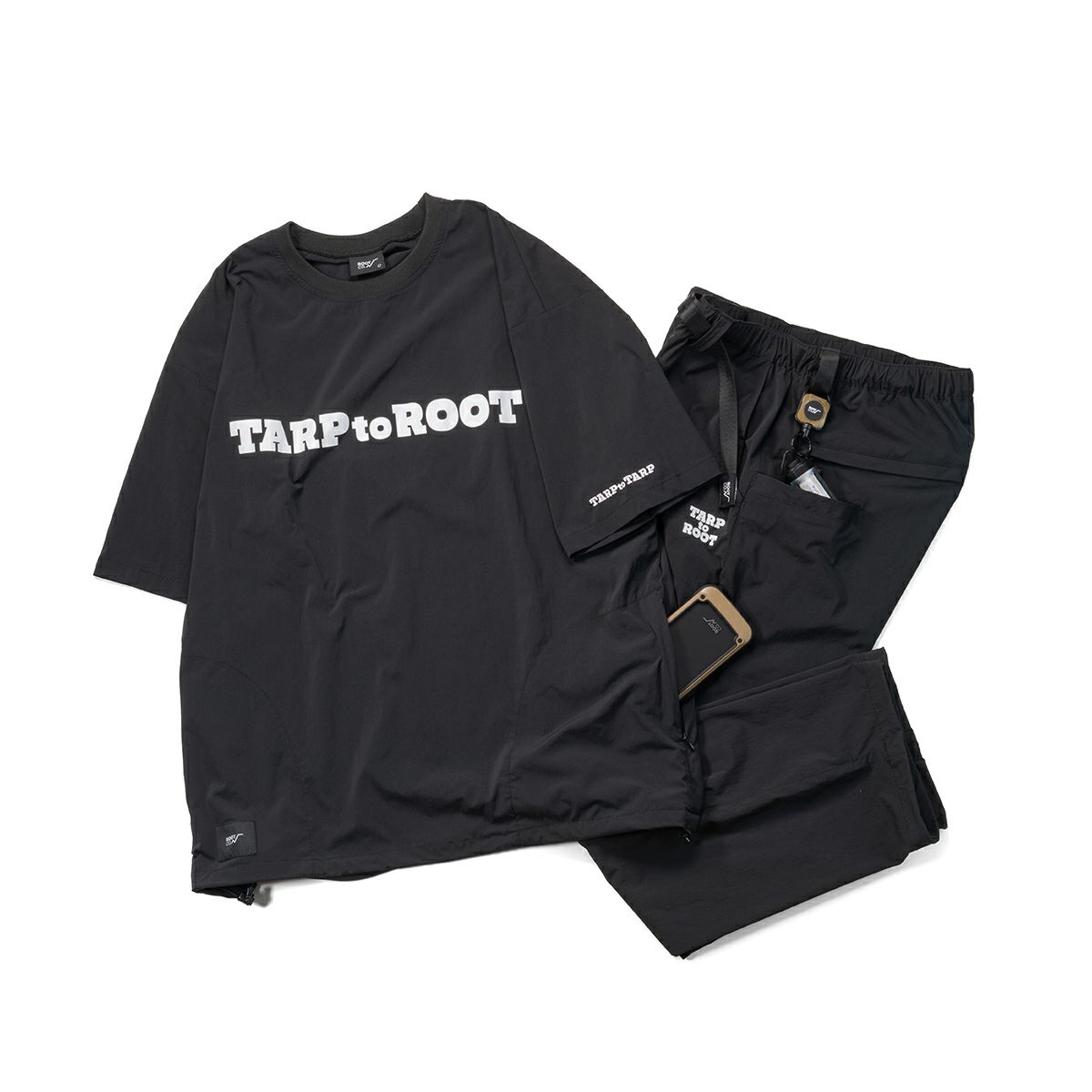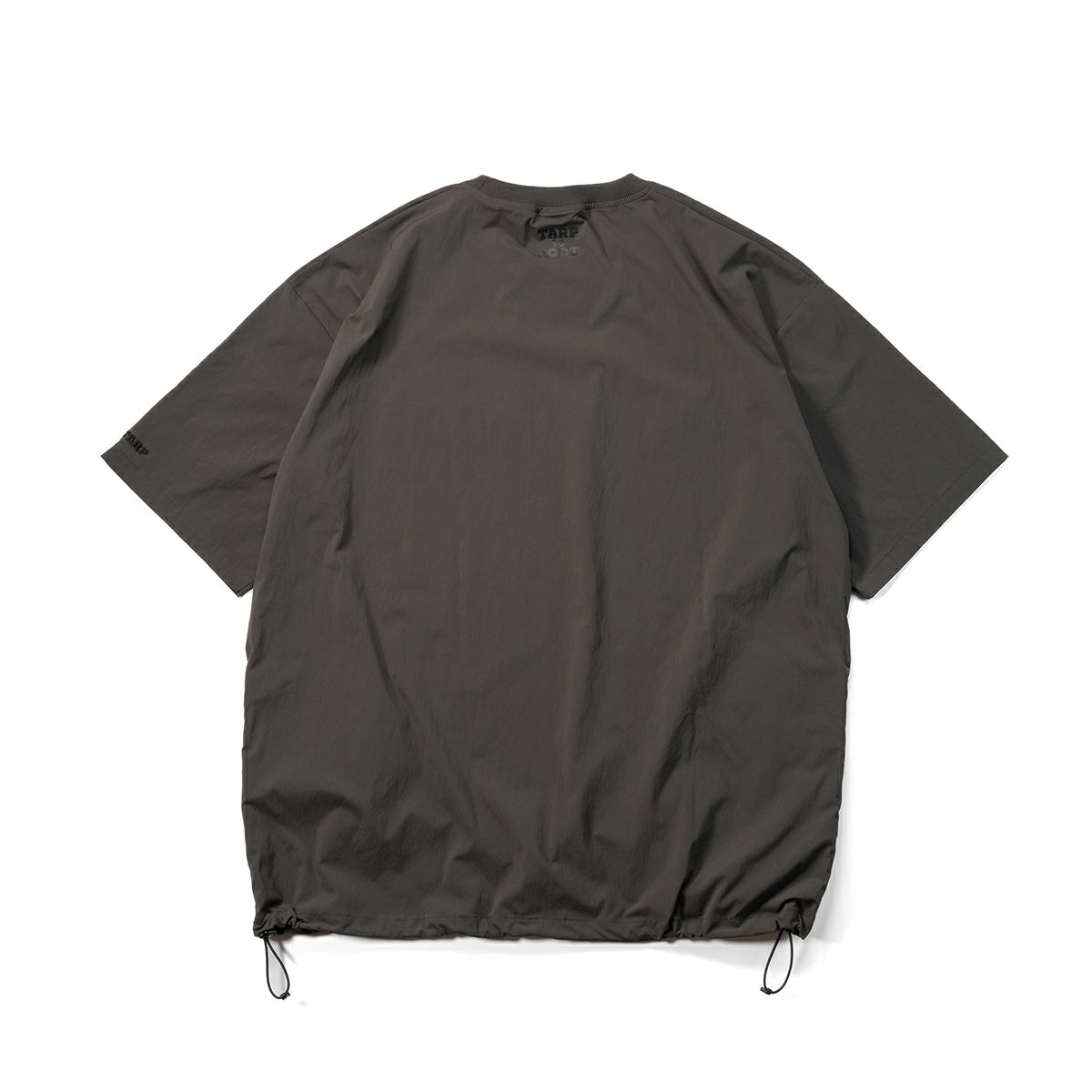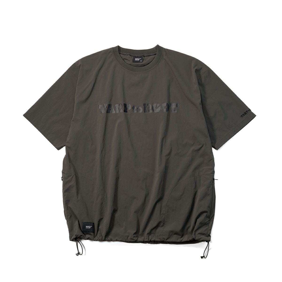 ボディサイドにコンシールファスナー付きのシームポケットを配した、シンプルなTARPtoTARP×ROOT CO.コラボレーションのオリジナルナイロンシャツです。ROOT CO.定番の「UTILITY BACK POCKET T-Shirts」よりも身巾を少し大きくデザインしたワイドシルエット。裾元両サイドのドローコードでシルエット調整が可能です。
