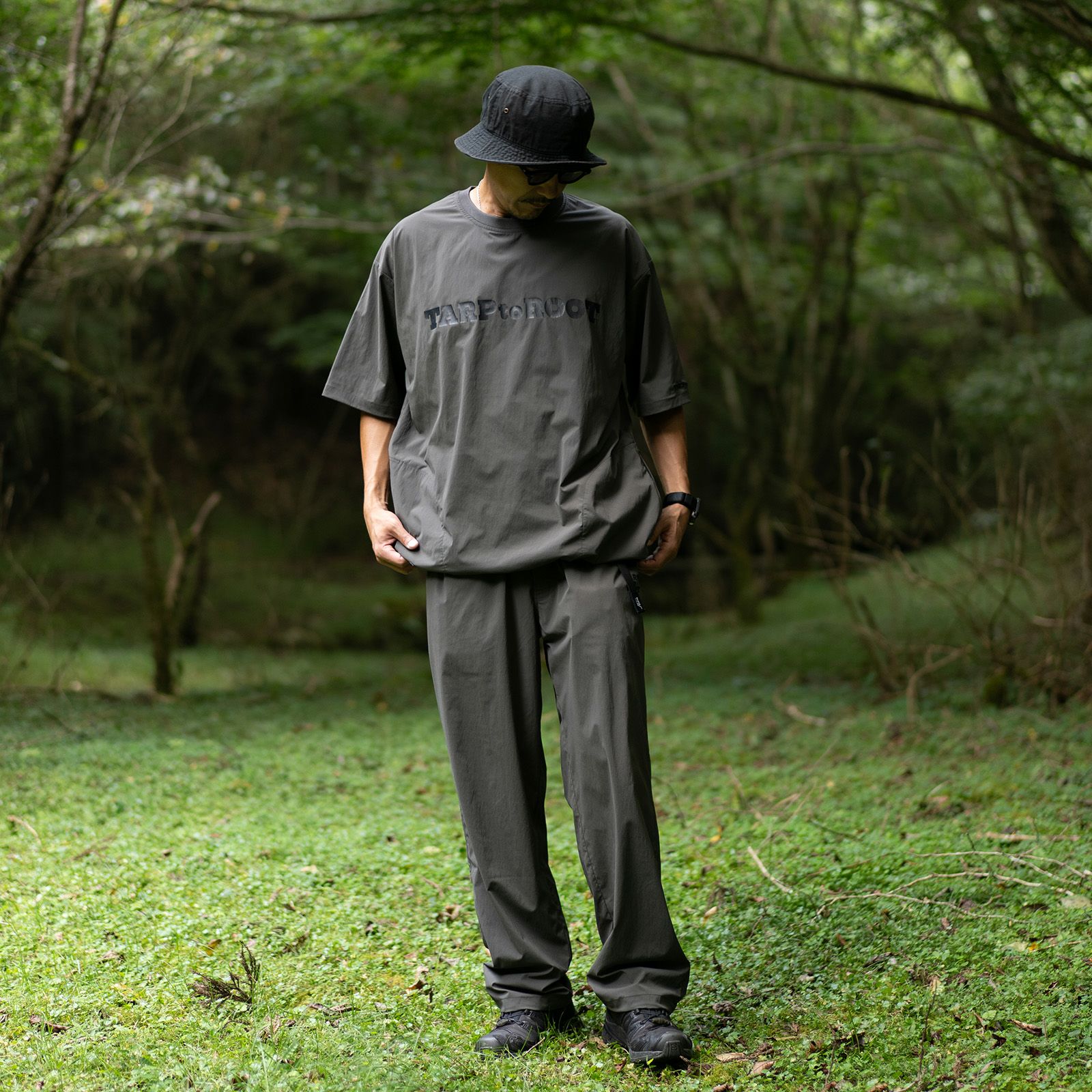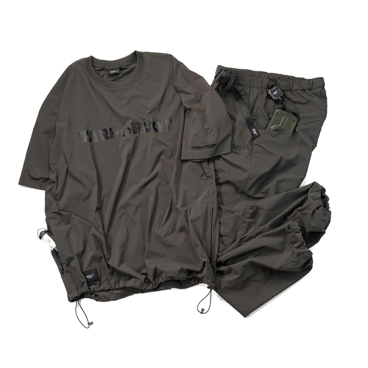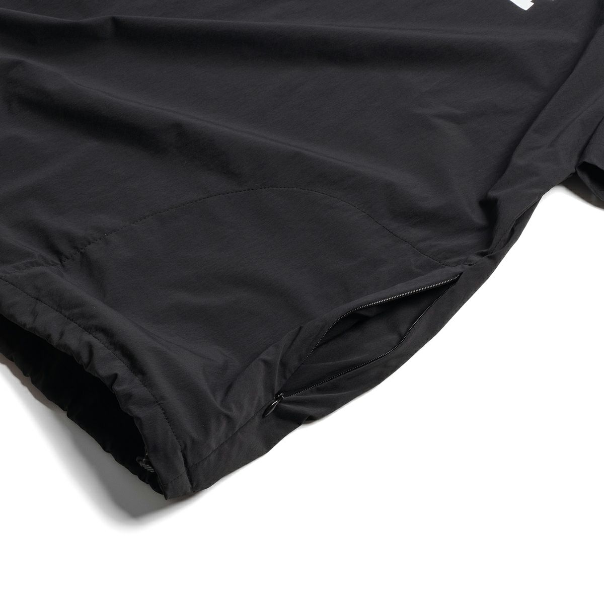 ボディサイドにコンシールファスナー付きのシームポケットを配した、シンプルなTARPtoTARP×ROOT CO.コラボレーションのオリジナルナイロンシャツです。ROOT CO.定番の「UTILITY BACK POCKET T-Shirts」よりも身巾を少し大きくデザインしたワイドシルエット。裾元両サイドのドローコードでシルエット調整が可能です。
