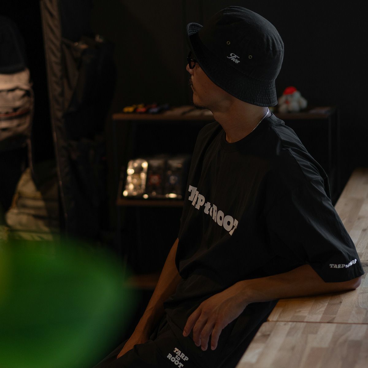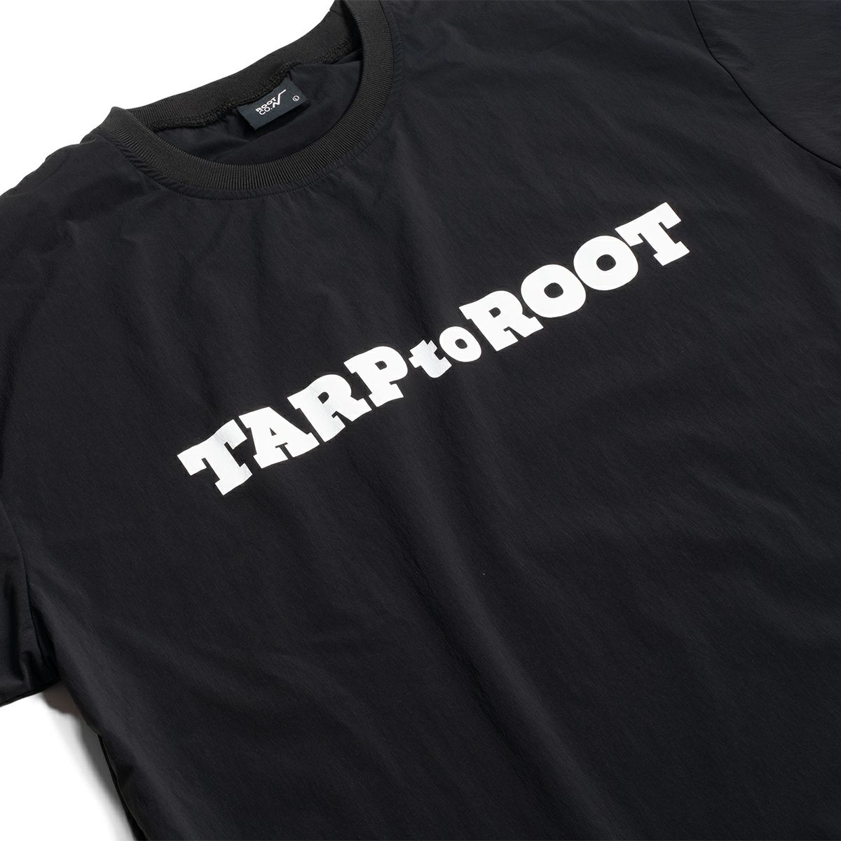 TARPtoTARP×ROOT CO.コラボレーションモデル。TARPtoTARPオリジナルフォントのコラボロゴを胸元や首元にプリント、左袖部にもTARPtoTARPロゴを刺繍しました。