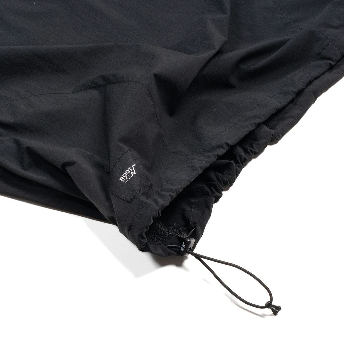 両サイドにドローコードを配した裾元デザインでシルエットの調整が可能。ドローコードのパーツにもROOT CO.ロゴをプリントしています。