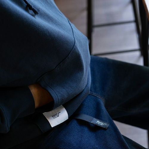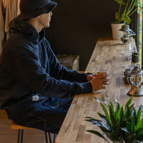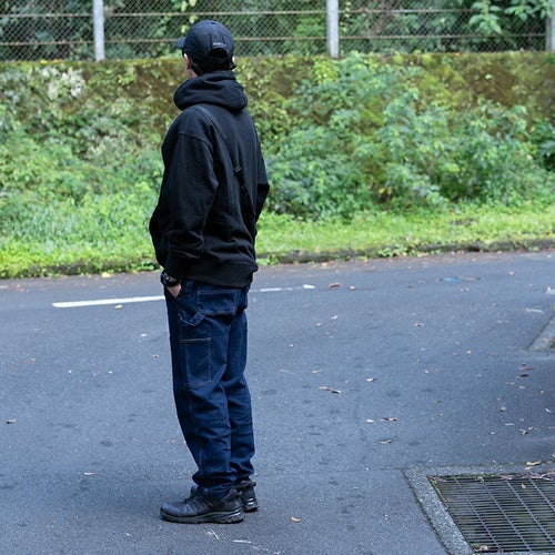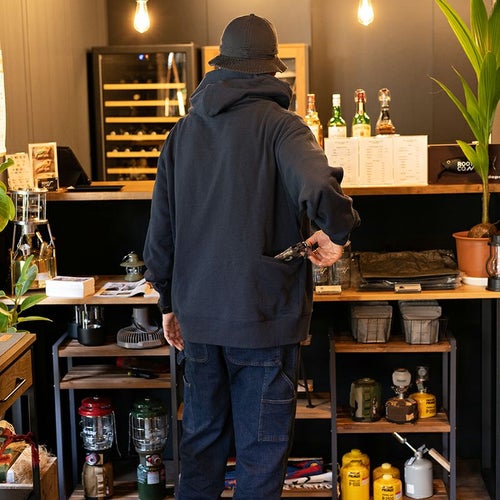 本体はUSAコットン100%の程良い厚みの生地を使用。カラーはブラック・ネイビー・グレーの3カラー、程良い厚みでざっくりした風合いの1着です。