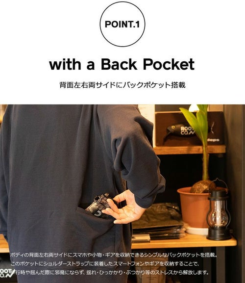 ボディの背面左右両サイドにシンプルなバックポケットを搭載。このポケットにショルダーストラップに装着したスマートフォンやギアを収納することで、歩行時や屈んだ際に邪魔にならず、揺れ・ひっかかり・ぶつかり等のストレスから解放します。