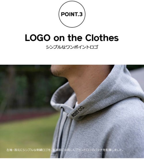 左袖や首元のブランドロゴ(刺繍)がワンポイントに。また、右裾部にはロゴがプリントされたパッチを配しました。