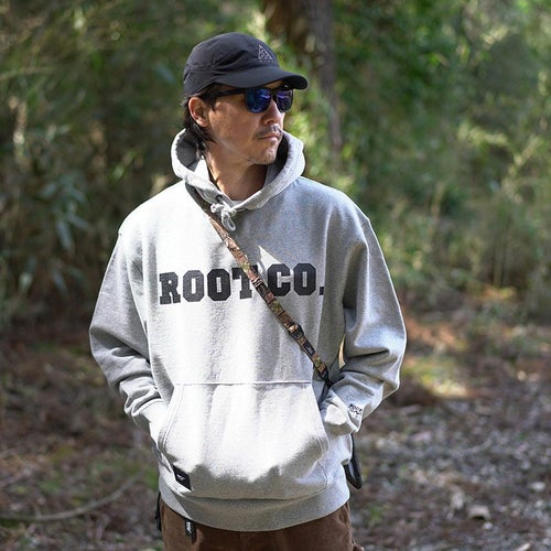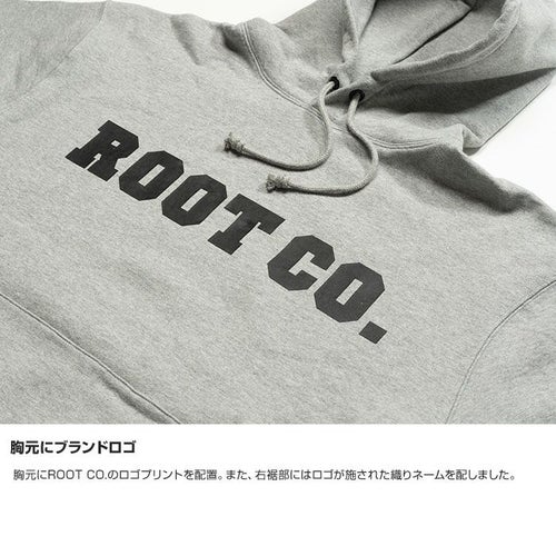 胸元にROOT CO.のロゴプリントを配置。また、右裾部にはロゴが施された織りネームを配しました。