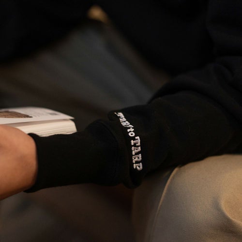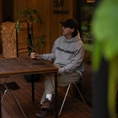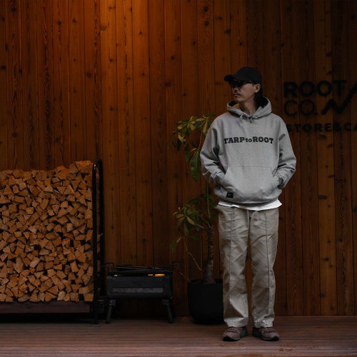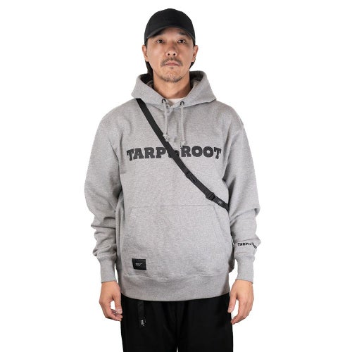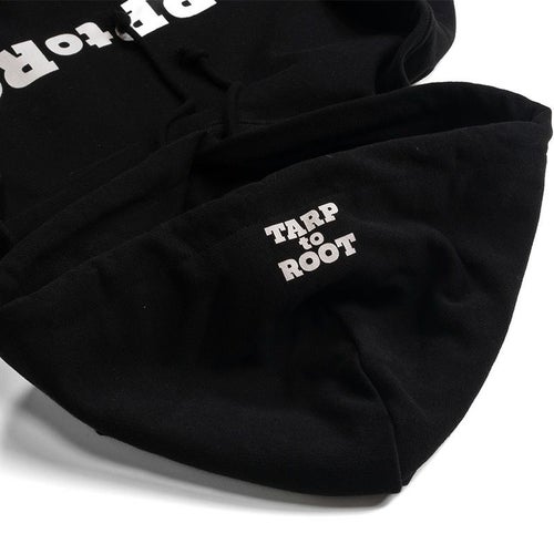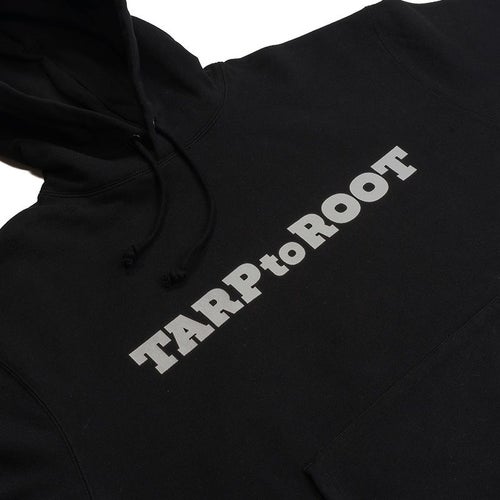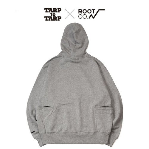 TARPtoTARP×ROOT COコラボレーションモデル。TARPtoTARPオリジナルフォントのコラボロゴをフロントとフードにプリントしました。また、左袖元にTARPtoTARPの刺繍ロゴを配置しています。