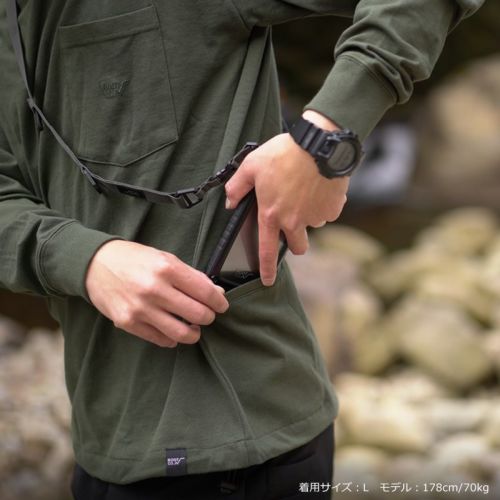ショルダー掛けのスマホやギアを収納でき、走ったり屈んだりしても揺れやズレ落ちを抑えます。ベルクロ付きのポケットになっていて、収納した物の落下等も軽減します。主張しすぎないバックポケットデザインで、シンプルな印象に仕上げました。