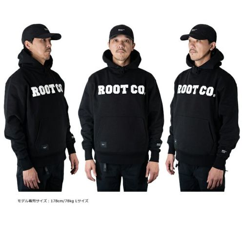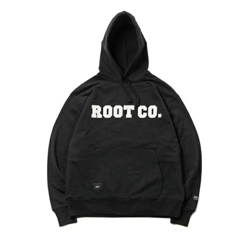胸元にROOT CO.のロゴプリントを配置。また、右裾部にはロゴが施された織りネームを配しました。