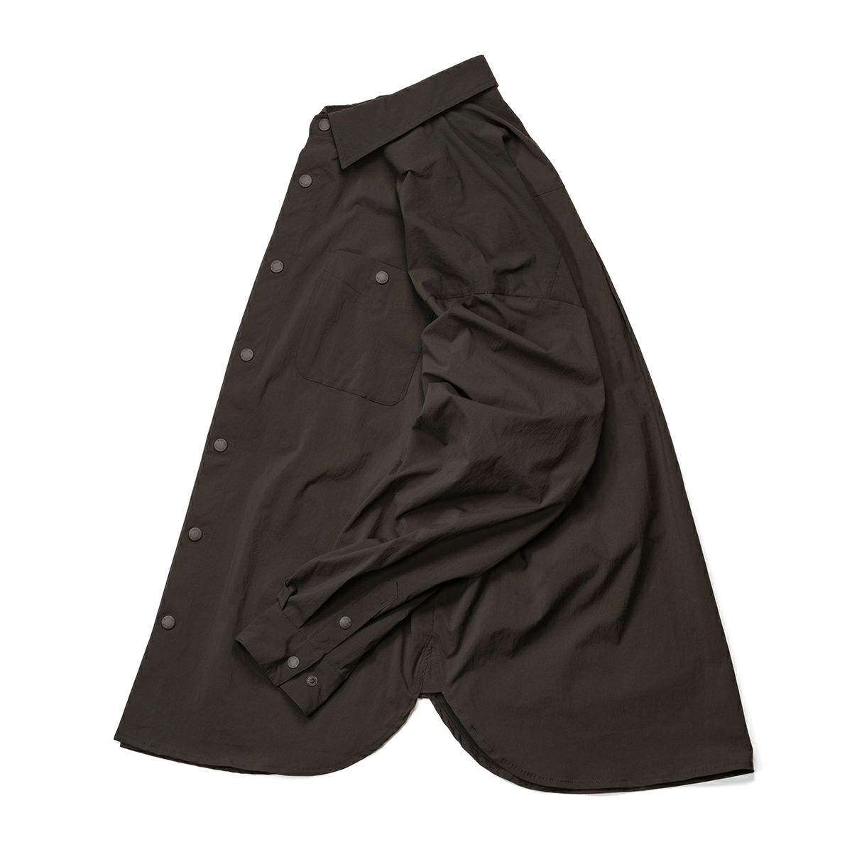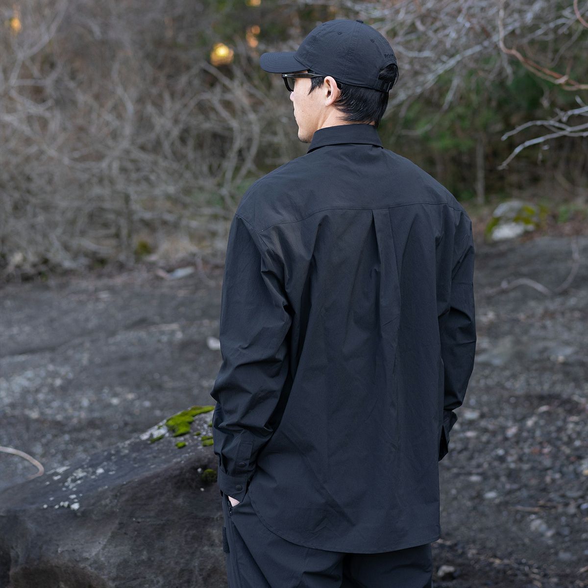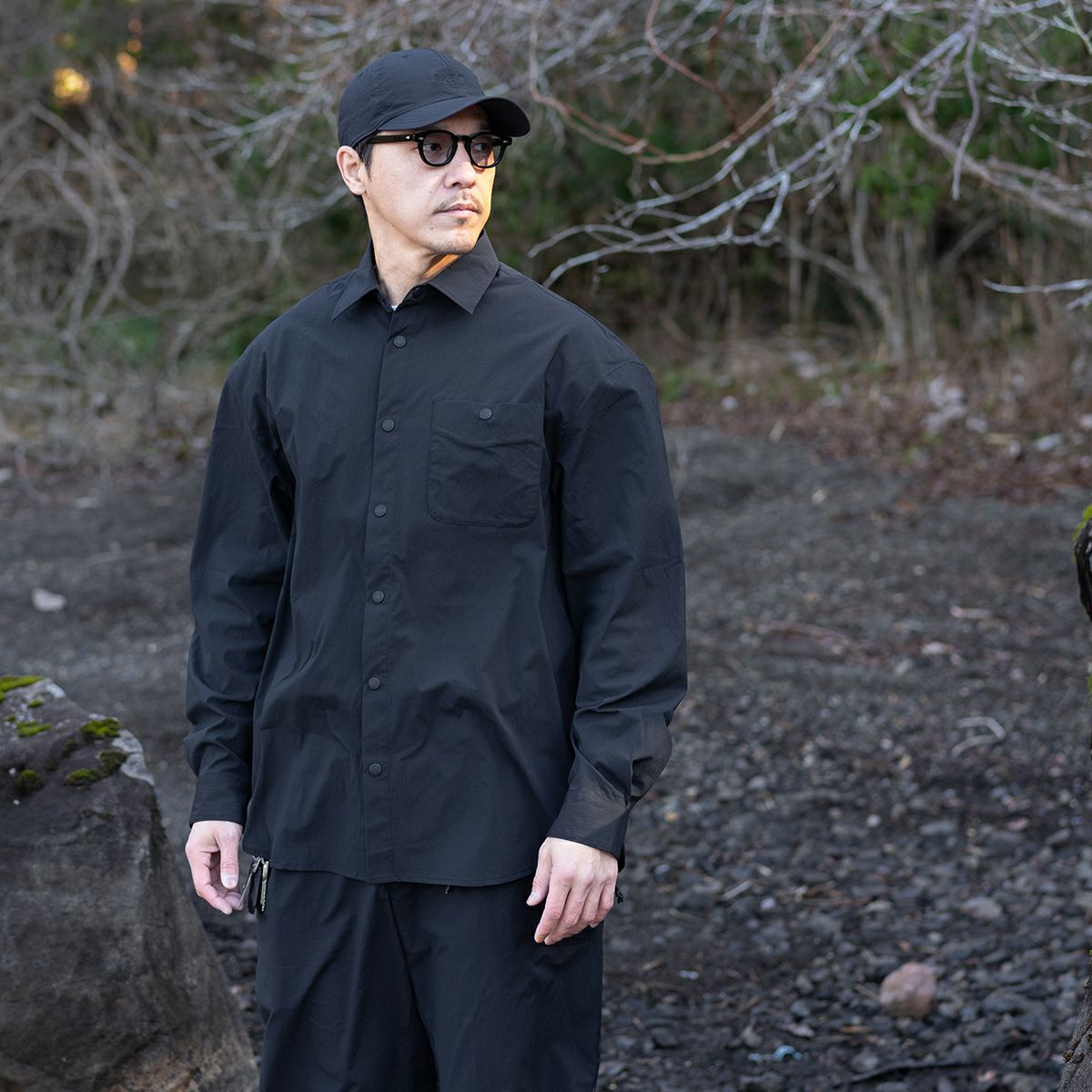 2026年新作、伸縮性に優れたナイロン素材を採用し、アウトドアシーンから日常まで着用できるボタンシャツ『PLAY STRETCH UTILITY Long Sleeve Button Shirts』。スナップボタンにのみロゴをさりげなく配した、ミニマルなデザインです。