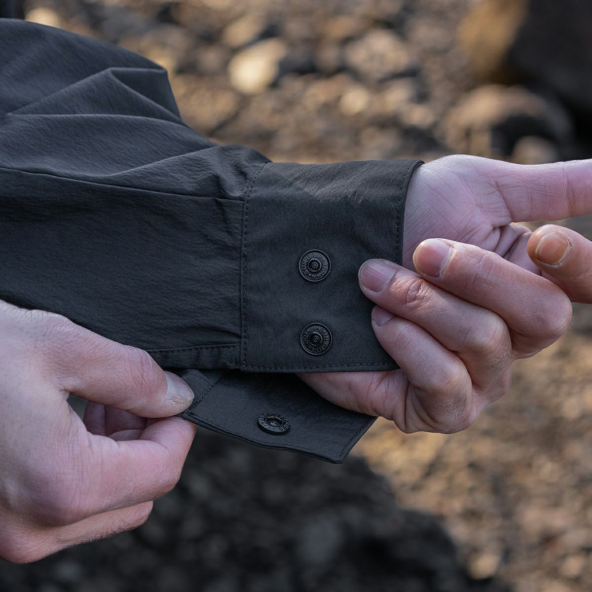 ラフに着用できるよう全てのボタンをスナップボタンにしました(前立て・胸ポケット・剣ボロ・カフス部分)。袖口巾の調整ができるよう、カフス部にはボタンを2つ設けています。