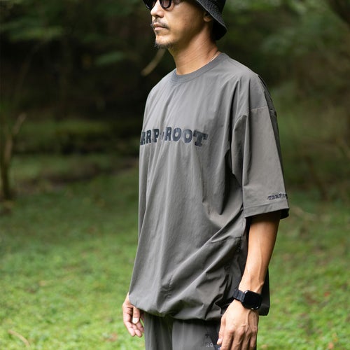 ボディサイドにコンシールファスナー付きのシームポケットを配した、シンプルなTARPtoTARP×ROOT CO.コラボレーションのオリジナルナイロンシャツです。ROOT CO.定番の「UTILITY BACK POCKET T-Shirts」よりも身巾を少し大きくデザインしたワイドシルエット。裾元両サイドのドローコードでシルエット調整が可能です。