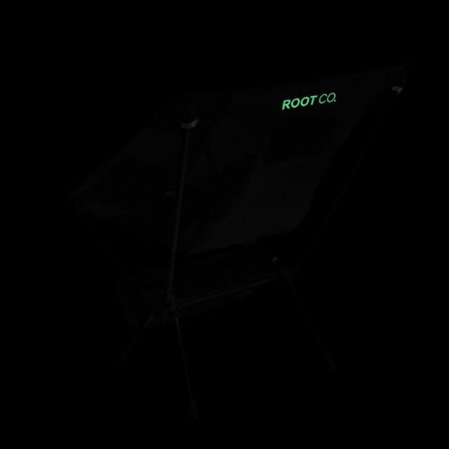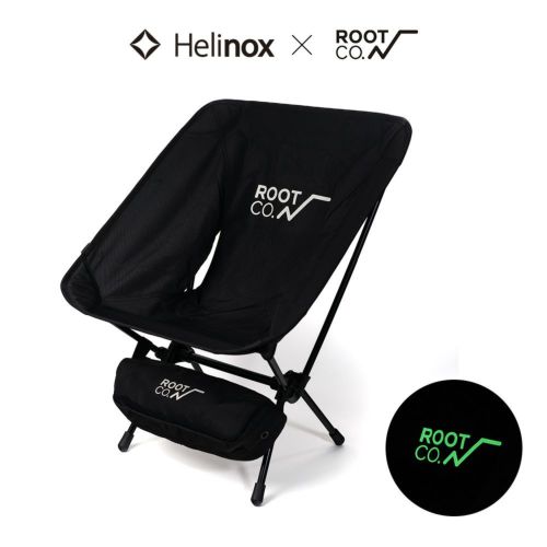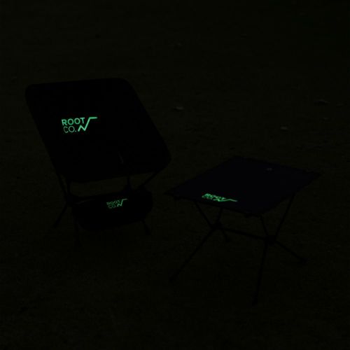 Helinoxタクティカルチェアに蓄光(グローグリーン)のROOT CO.ロゴをプリントした別注アイテム。キャンプシーンに新たな彩りを与えます。