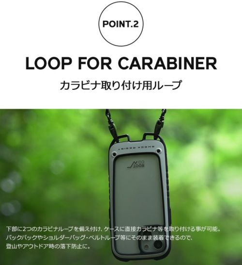 米国環境耐性試験「MIL-STD-810G 516.6Procedure Ⅳ」の耐衝撃試験に準拠した耐衝撃性能はもちろん、下部に搭載されたカラビナループにはカラビナなどを直接ケースに取り付ける事ができるので、バックパックやショルダーバッグ・ベルトループ等にiPhoneをそのまま装着、登山やアウトドア時の落下防止が可能です。