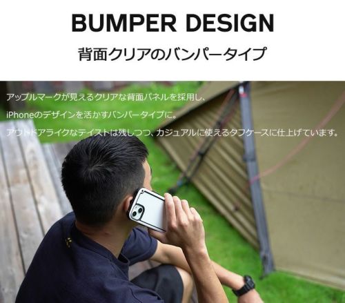 アップルマークが見えるクリアな背面パネルを採用し、iPhoneのデザインを活かすバンパータイプに。アウトドアライクなテイストは残しつつ、カジュアルに使えるタフケースに仕上げています。