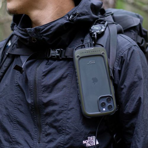 米国環境耐性試験「MIL-STD-810G516.6ProcedureⅣ」の耐衝撃試験に準拠した耐衝撃性能はもちろん、下部に搭載されたカラビナループにはカラビナなどを直接ケースに取り付ける事ができるので、バックパックやショルダーバッグ・ベルトループ等にiPhoneをそのまま装着、登山やアウトドア時の落下防止が可能です。