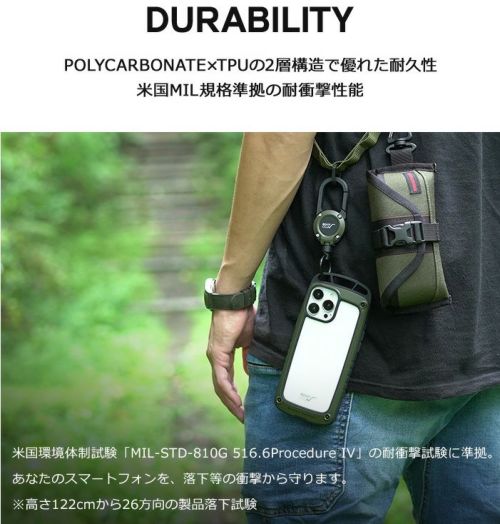 ROOT CO.iPhoneケースの象徴ともいえるカラビナループを進化させました。ループ内が3つに分割された特徴的なカラビナループが、ギアやアクセサリーを使ったアウトドアにおけるiPhoneの拡張性を強化。耐衝撃性は米国MIL規格に準拠した、「アウトドアを楽しむ」ためのiPhoneケースです。