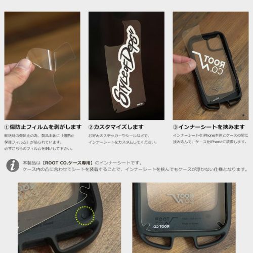 ROOT CO.の背面クリアiPhoneケース「Elk.」「+Hold.」「Tough&Basic」に対応した、自由にカスタマイズ可能な背面インナーシート。ステッカーやシールなどでお好みにカスタムすることで、端末(iPhone)やケースに直接ステッカーを貼らずにオリジナルのiPhoneへと着せ替える事が可能です。パターンをいくつもつくれば、シーンや気分に合わせて簡単に取替える事もできます。