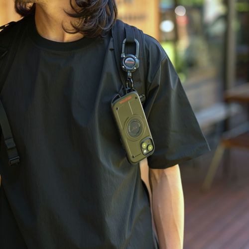 別売りのマグネット式リールカラビナ「MAG REEL 360」スマホショルダーストラップ「UTILITY WEBNING NECK/SHOULDER LOOP」を取り付ける事が可能。もちろんお手持ちのカラビナ等を装着することもできます。
