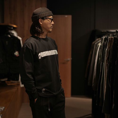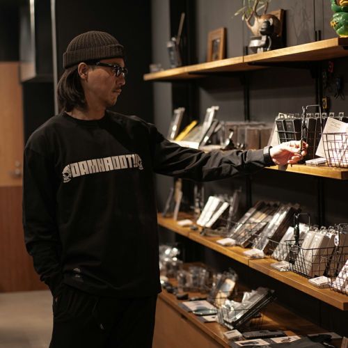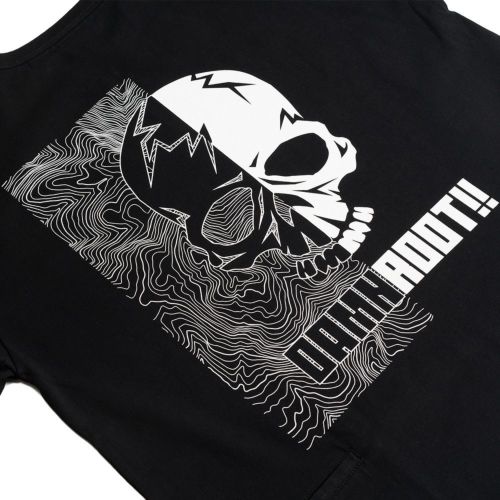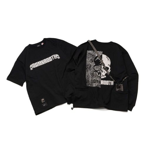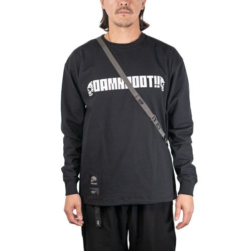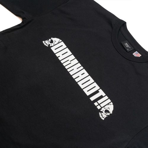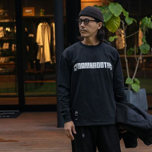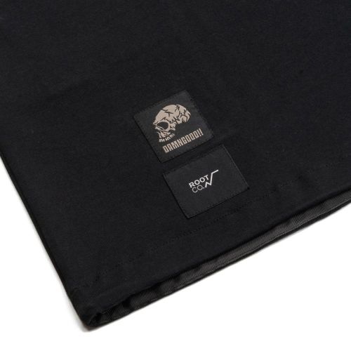 DAMNGOOD!! × ROOT CO.コラボレーションモデル。DAMNGOOD!!オリジナルフォントのコラボロゴをフロント・バックにプリントしました。裾元にはDAMNGOOD!!・ROOT CO.両ブランドの織ネームを配置。