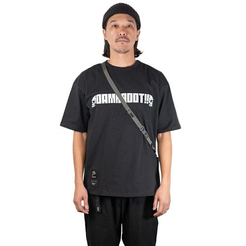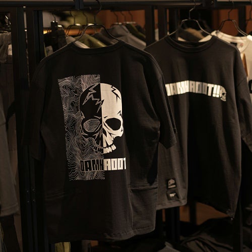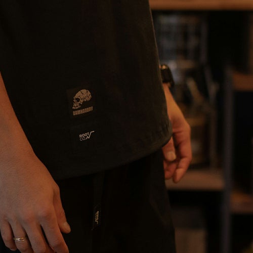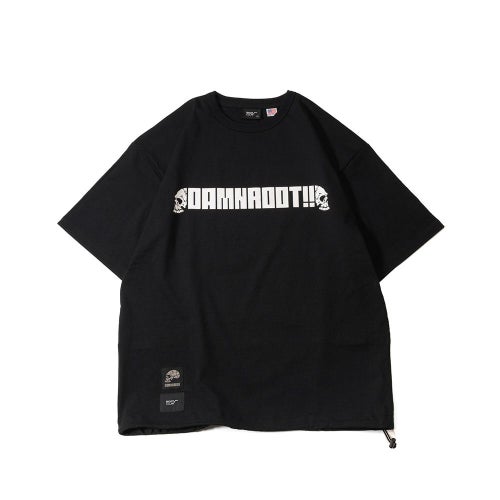 DAMNGOOD!! × ROOT CO.コラボレーションモデル。DAMNGOOD!!オリジナルフォントのコラボロゴをフロント・バックにプリントしました。裾元にはDAMNGOOD!!・ROOT CO.両ブランドの織ネームを配置。