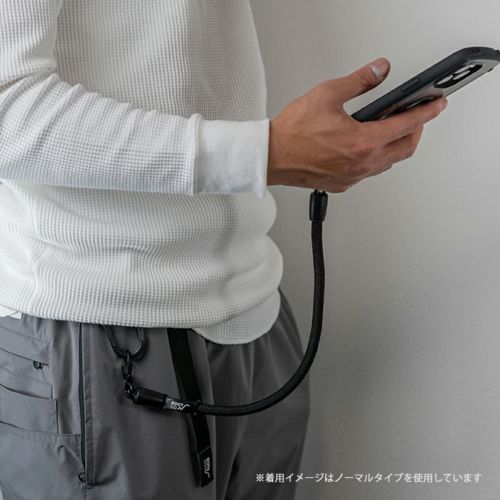 手首にかけられる短くかさばらない長さのショートストラップ。落下防止のハンドストラップとしてはもちろん、パンツのウエストループ等と繋いで紛失・落下防止のウォレットコードとしても使用できます。肩がけタイプのショルダーストラップと用途にあわせて使い分けても。