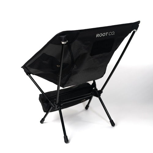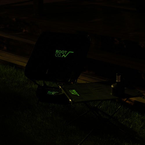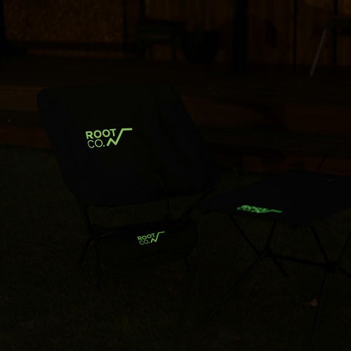 Helinoxタクティカルチェアに蓄光(グローグリーン)のROOT CO.ロゴをプリントした別注アイテム。キャンプシーンに新たな彩りを与えます。