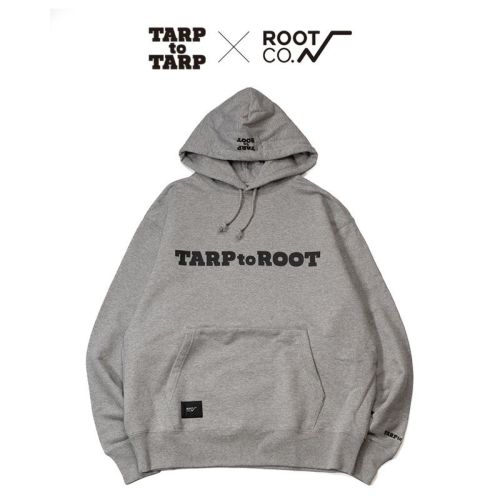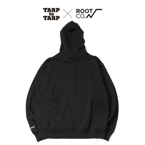 TARPtoTARP×ROOT COコラボレーションモデル。TARPtoTARPオリジナルフォントのコラボロゴをフロントとフードにプリントしました。また、左袖元にTARPtoTARPの刺繍ロゴを配置しています。