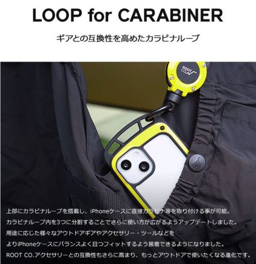 ケース上部にカラビナループを搭載し、iPhoneケースに直接カラビナ等を取り付ける事が可能。カラビナループ内を3つに分割することで、さらに使い方が広がるようアップデートしました。2点吊りタイプのショルダーストラップやウェビングベルト、カラビナなど、用途に応じた様々なアウトドアギア・アクセサリー・ツールをよりiPhoneケースにバランスよく且つフィットするよう装着ができます。ROOT CO.アクセサリーとの互換性もさらに高まり、もっとアウトドアで使いたくなるよう進化しました。