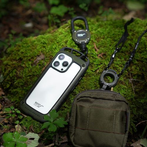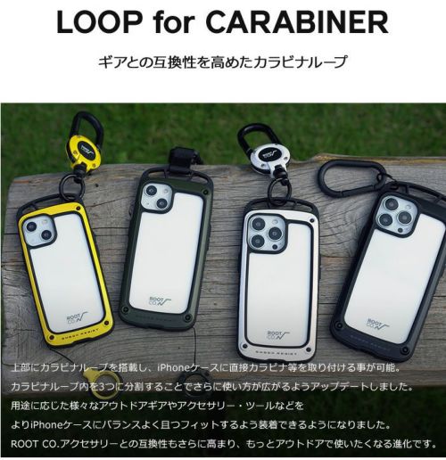 ROOT CO.iPhoneケースの象徴ともいえるカラビナループを進化させました。ループ内が3つに分割された特徴的なカラビナループが、ギアやアクセサリーを使ったアウトドアにおけるiPhoneの拡張性を強化。耐衝撃性は米国MIL規格に準拠した、「アウトドアを楽しむ」ためのiPhoneケースです。