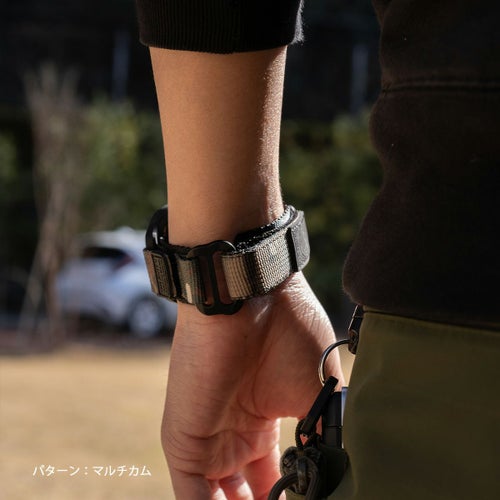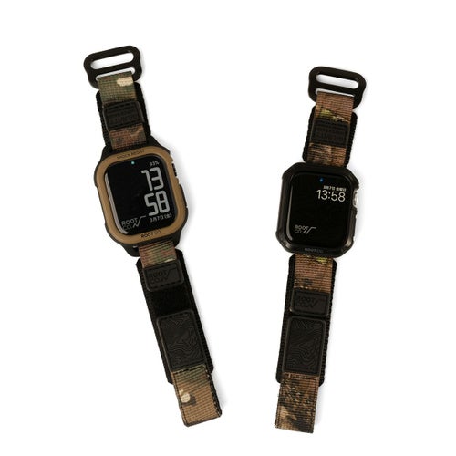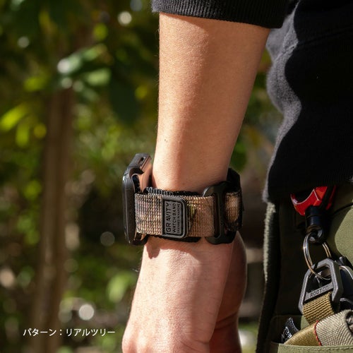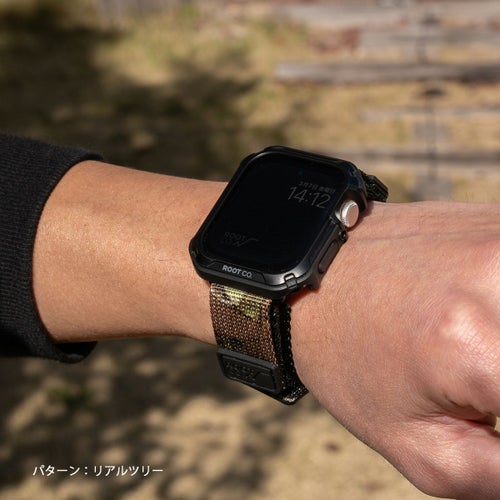 耐久性のあるナイロンウェビングを採用、アウトドアの様々なフィールドでタフに使えるROOT CO.オリジナルのApple Watch用バンドの、MILITALY EDITION(カモフラージュタイプ)。