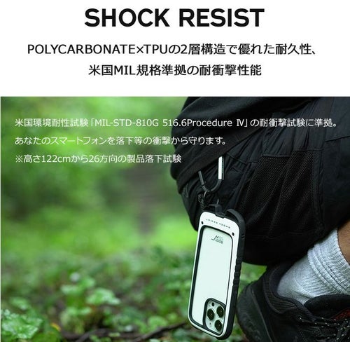 米国環境耐性試験「MIL-STD-810G 516.6Procedure Ⅳ」の耐衝撃試験に準拠した耐衝撃性能はもちろん、下部に搭載されたカラビナループにはカラビナなどを直接ケースに取り付ける事ができるので、バックパックやショルダーバッグ・ベルトループ等にiPhoneをそのまま装着、登山やアウトドア時の落下防止が可能です。