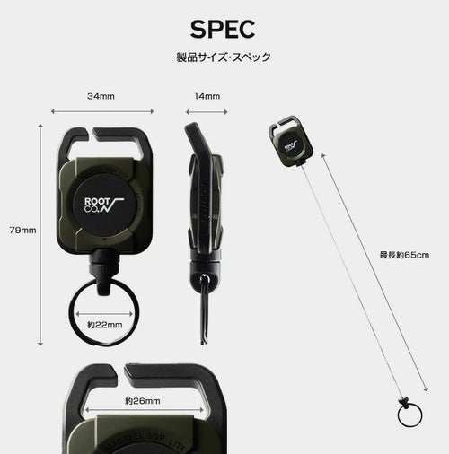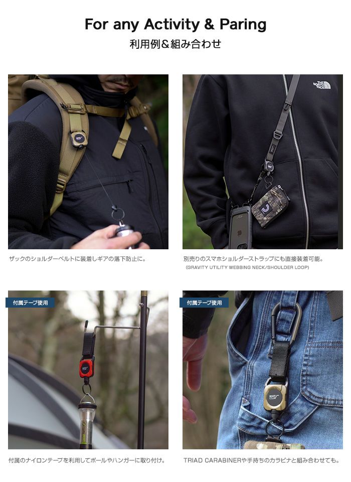 小銭入れ・ポーチなど、大切なアイテムを吊り下げれば落下防止や紛失防止に。さらにリール内から伸縮自在なコードを伸ばすことでカラビナリール(キーリール)やピンオンリールとして、使いたいときにスマートにアイテムを手元で使うことができます。